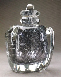 flaconi in vetro trasparente, ad acido o alla ruota o con tutte e due le tecniche combinate, passando da una figurazione stilizzata alla pura geometria, poi all'astrazione.