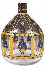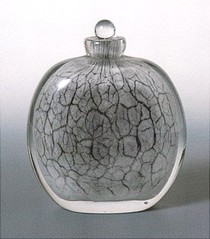 flaconi in vetro trasparente, ad acido o alla ruota o con tutte e due le tecniche combinate, passando da una figurazione stilizzata alla pura geometria, poi all'astrazione.
