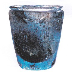 soffiatura, ottiene effetti particolari intercalando fra gli strati polvere di rame o limatura di metallo o anche paillettes d'oro. In altri pezzi, con l'ottica del pittore, fa