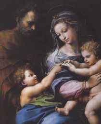 Raffaello Sanzio (Urbino 1483- 1520) a 10 anni è allievo prediletto nella bottega del Perugino. La sua arte rimase per secoli esempio per svariate scuole pittoriche. Raffaello, l'uomo del Rinascimento, la luce e l'ombra percorre la sua divina fantasia, ci rivela la grande pittura del XVI secolo, grazia e bellezza. Opere scatenate dall'incontro con altre due illustri personalità guida del culminante Rinascimento, suoi amici-rivali, Leonardo (1452-1519) e Michelangelo (1475-1564) per la sublime e idillica Universalità raggiunta.